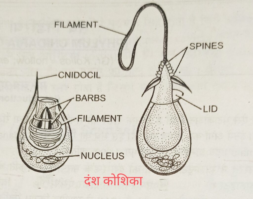 6 – देहभित्ति में अन्तराली कोशिकाओं (interstitial cells) तथा दंश कोशिकाओं (cnidoblast or nematoblast) की बैटरी पायी जाती है | दंश कोशिकाएं आधार से चिपकने , आत्म रक्षा तथा भोजन पकड़ने में सहायता करती हैं |